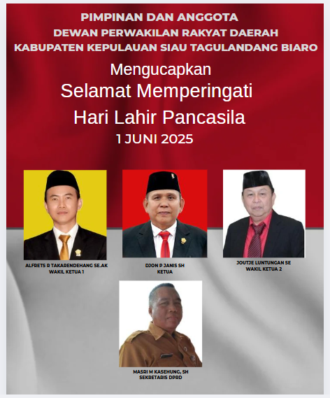 Sitaro, 1 Juni 2025 — Dewan Perwakilan Rakyat Daerah (DPRD) Kabupaten Kepulauan Siau Tagulandang Biaro (Sitaro) mengucapkan Selamat Memperingati Hari Lahir Pancasila kepada seluruh masyarakat Sitaro, dan bangsa Indonesia secara umum.