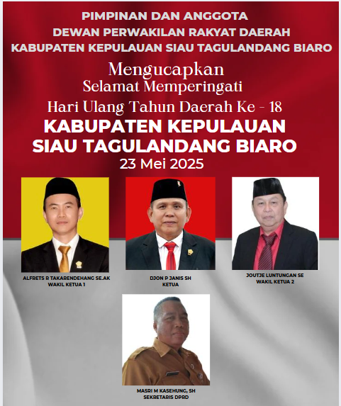 Pimpinan dan Anggota Dewan Perwakilan Rakyat Daerah (DPRD) Kabupaten Kepulauan Sitaro menyampaikan ucapan Selamat Hari Jadi ke-18 kepada seluruh masyarakat Sitaro, sembari mengajak untuk terus memperkuat kebersamaan dan komitmen membangun daerah tercinta.