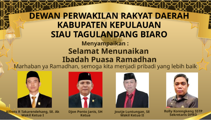 SITARO – Dewan Perwakilan Rakyat Daerah Kabupaten Kepulauan Siau Tagulandang Biaro (DPRD Kabupaten SITARO) menyampaikan ucapan selamat menunaikan atau menjalankan ibadah Puasa Ramadhan 1447 Hijriah kepada seluruh umat Muslim di Kabupaten Kepulauan Siau Tagulandang Biaro dan sekitarnya.