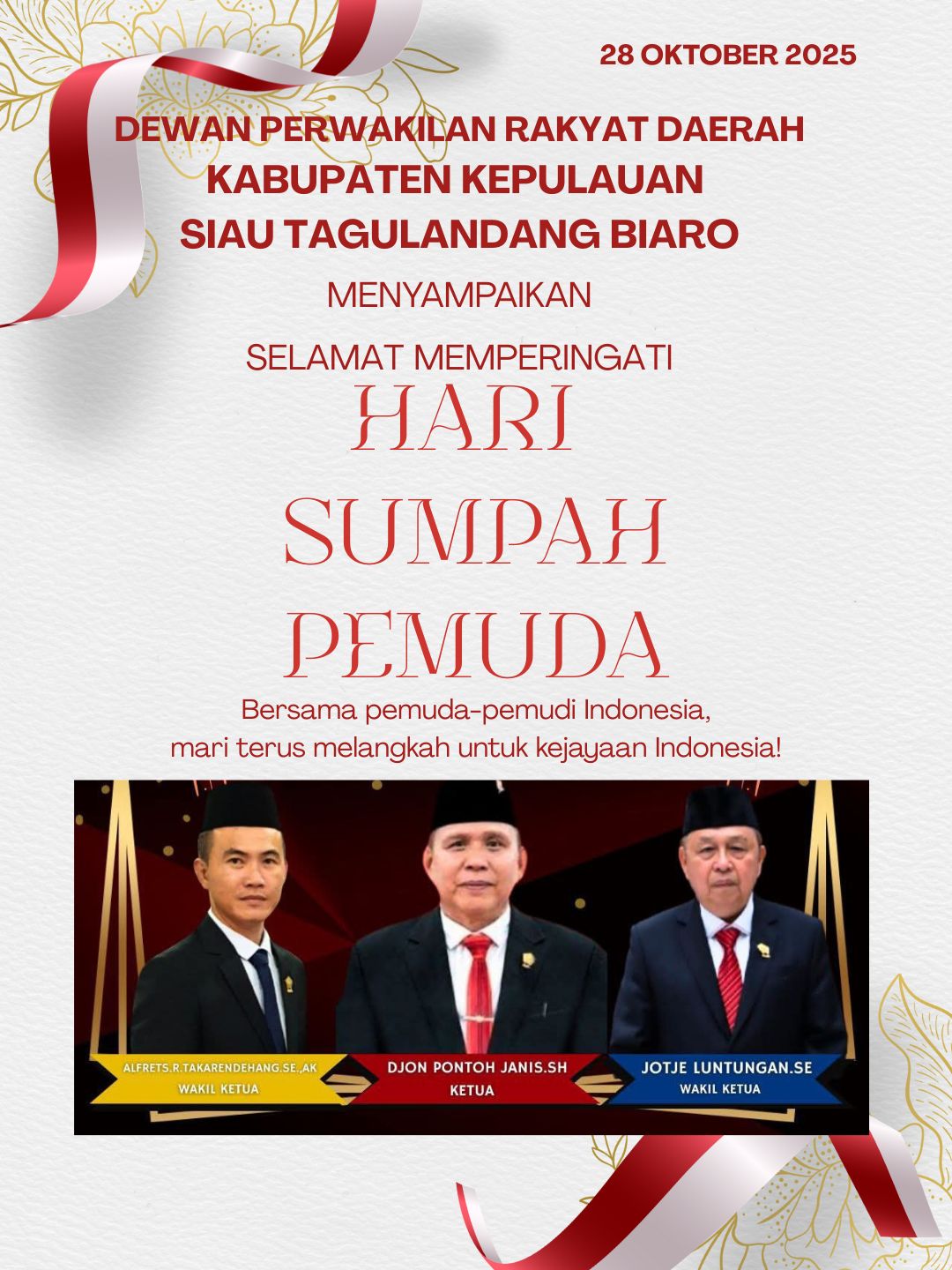 Memperingati Hari Sumpah Pemuda 28 Oktober 2025, Ketua Dewan Perwakilan Rakyat Daerah (DPRD) Kabupaten Siau Tagulandang Biaro (Sitaro), Djon Ponto Janis, menyampaikan pesan khusus kepada seluruh pemuda dan masyarakat Sitaro. Menurutnya, semangat persatuan yang lahir dari ikrar Sumpah Pemuda 1928 harus terus dirawat dan diterjemahkan dalam tindakan nyata.